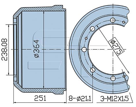 Navboringsdiameter [mm]: 238 mmMonteringsside: forakselBremse distance [mm]: 210 mmDiameter [mm]: 364 mmHøjde [mm]: 251 mmBoringsdiameter [mm]: 21 mmGevindmål: M 12x1,5Antal huller: 8Pitch cirkel-Ø [mm]: 275 mm