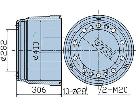 Antal huller 1: 2Navboringsdiameter [mm]: 282 mmMonteringsside: bagakselBremse distance [mm]: 230 mmDiameter [mm]: 410 mmHøjde [mm]: 306 mmBoringsdiameter [mm]: 28 mmGevindmål: M 20Antal huller: 10Pitch cirkel-Ø [mm]: 335 mmBoringsdiameter 1 [mm]: 18 mm