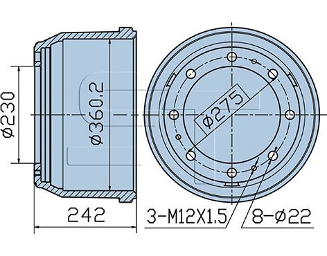 Antal huller 1: 2Navboringsdiameter [mm]: 230 mmMonteringsside: bagakselMonteringsside: forakselBremse distance [mm]: 174 mmDiameter [mm]: 360 mmHøjde [mm]: 242 mmBoringsdiameter [mm]: 22 mmGevindmål: M 12x1,5Antal huller: 8Pitch cirkel-Ø [mm]: 275 mm