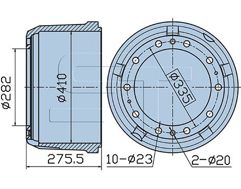 Antal huller 1: 2Navboringsdiameter [mm]: 282 mmMonteringsside: bagakselBremse distance [mm]: 230 mmDiameter [mm]: 410 mmHøjde [mm]: 275,5 mmBoringsdiameter [mm]: 23 mmGevindmål: M 12Antal huller: 10Pitch cirkel-Ø [mm]: 335 mmBoringsdiameter 1 [mm]: 14 mmBoringsdiameter 2 [mm]: 20 mm