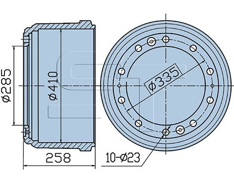 Antal huller 1: 2Antal huller 2: 2Navboringsdiameter [mm]: 285 mmMonteringsside: bagakselBremse distance [mm]: 209 mmDiameter [mm]: 410 mmHøjde [mm]: 257,5 mmBoringsdiameter [mm]: 23 mmGevindmål: M 12Antal huller: 10Pitch cirkel-Ø [mm]: 335 mmBoringsdiameter 1 [mm]: 11,5 mm