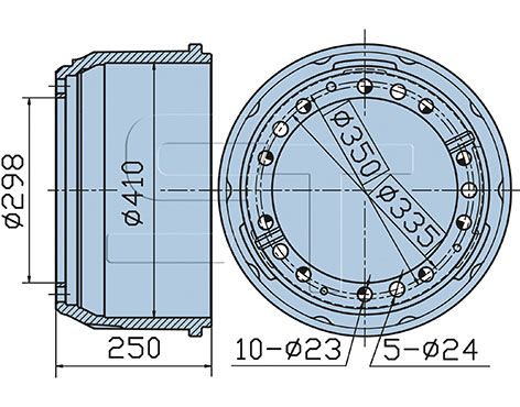 Antal huller 1: 5Navboringsdiameter [mm]: 298 mmMonteringsside: forakselBremse distance [mm]: 172 mmDiameter [mm]: 410 mmHøjde [mm]: 250 mmBoringsdiameter [mm]: 23 mmGevindmål: M 12x1,5Antal huller: 10Pitch cirkel-Ø [mm]: 335 mmBoringsdiameter 1 [mm]: 24 mm