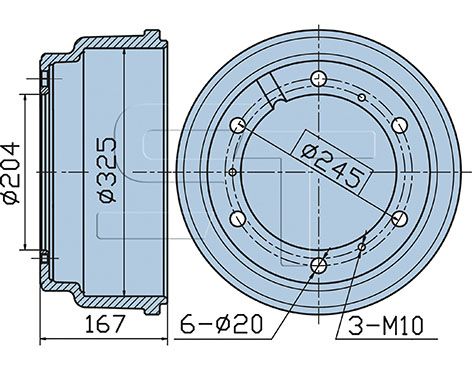 Navboringsdiameter [mm]: 204 mmMonteringsside: bagakselMonteringsside: forakselBremse distance [mm]: 110 mmDiameter [mm]: 325 mmHøjde [mm]: 167 mmBoringsdiameter [mm]: 20 mmGevindmål: M 10Antal huller: 6Pitch cirkel-Ø [mm]: 245 mm