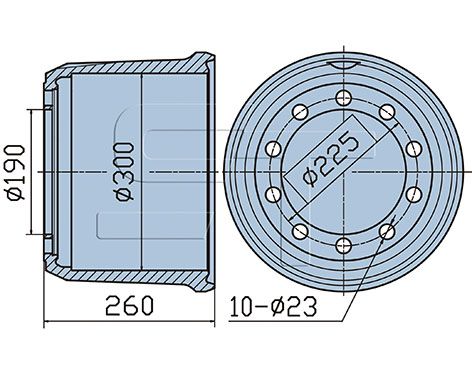 Diameter D: Ø 300 mm.. (Max. diameter 304 mm) Højde D: 260 mm. Bolt cirkel P: 225 mm. Navbolt huller: 10 x 23 mm.